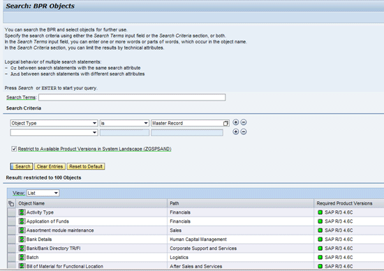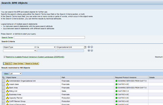 I’ll explore this new feature in two sections. First, I’ll show you a tour of the business process search capabilities and how to select from the results of the search. Then I’ll show you how to retrieve organizational units and master data from the BPR. For the sake of brevity, I’ll cover the anatomy and structure of the search screen only in the first section.