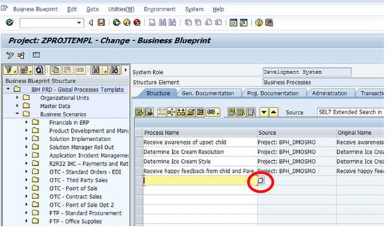 To access the new features of the SP05 BPR navigation, execute transaction SOLAR01 for the blueprint as usual. Navigate to the location on the BPH structure where you wish to add content from the BPR. Note that the Source drop-down has a new value: SEL7 Extended Search in Business Process Repository, which is now the default (Figure 1).