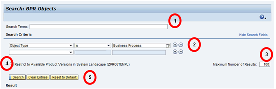 1) Search Terms: This field allows you to enter words that you expect to find in the object name. For example, entering the word Orders in this field returns processes such as Billing Subscription Orders or Entering Shipping Orders.