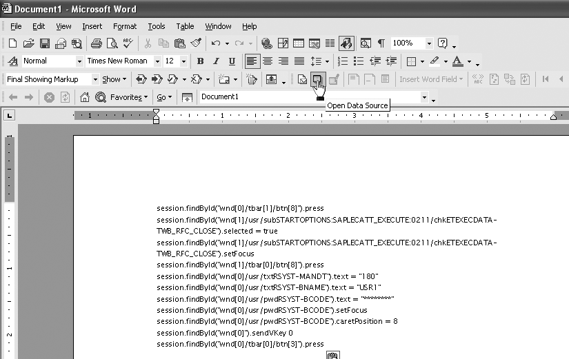 Those who are familiar with Visual Basic (VB) programming and Excel macros can take the above script code and run it through a DO loop in VB for your number of user IDs and passwords stored in a file you want to test. If you are not familiar with VB, here is a simple method: Open up your desktop application Microsoft Excel and create a data source file for user IDs in a new worksheet with two columns, User ID and Password. Then create a new document in Microsoft Word. Copy the lines that repeat for all the users from your SAPGUI script and paste them into your new document. In Microsoft Word, open the Mail Merge toolbar. Click on the Open Data Source button (Figure 13).