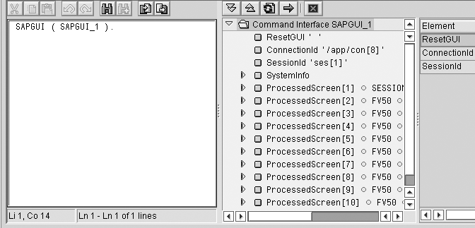 After the script ZJ01_FV50_DEMO_SAPGUI is recorded, the Editor tab has the recorded command in the Command Editor area of the window, highlighted in Figure 5 with a rectangle. It is a good idea to save the script now. The text SAPGUI_1 in brackets with the recorded command SAPGUI is the command interface recorded. Double-click it to display its details, which opens in a new frame in XML structure format to the right of Command Editor (Figure 5). You may choose to parameterize it, but in this example, I shall not. Instead I’ll run the tests with the values recorded in the script, so I’ll accept the values entered in the recording.