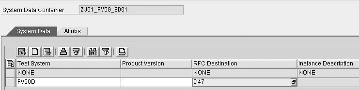 Next, you create a system data container using the RFC destination, modify your test script from step 1 to include it, and then test it. To create a system data container, go back to transaction SECATT. Choose the option System data and give a name, say ZJ01_FV50_SD01. Click on the Create Object button. Enter a title, FV50 Demo in this example, for the system data container. Save it as a local object (package $TMP). On the System Data tab, click on the Create (Append Row) button. Enter the name of the test system, FV50D in this case, and choose the RFC destination you just established (Figure 9). Save your changes.