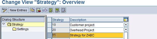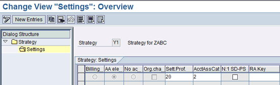 Follow IMG menu path Project System > Costs > Automatic and Periodic Allocations > Settlement > Settlement Rule for Work Breakdown Structure Element. The first step in settlement strategy is to determine a strategy for the settlement rule. To create a new settlement strategy, click the execute icon beside Determine Strategy for Settlement Rule. The settlement strategy allows you to create settlement rules based on the WBS master data fields. Defining the strategy enables the settlement strategy program to generate the settlement rule based on the cost objects defined on the master data of the WBS elements. In the settlement strategy screen, click the New Entries button on the left column. Specify the name and description for your strategy. In my example I create strategy Y1 for company code ZABC (Figure 1).
