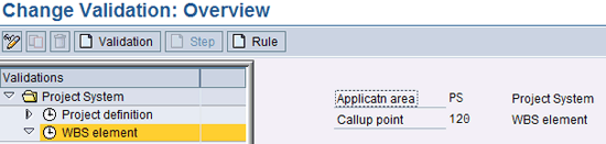 Follow IMG menu path Project System > Structures > Operative Structures > Work Breakdown structures > Maintain validations. In the Change Validation screen, highlight the WBS element in the left side and click the Validation button (Figure 10).