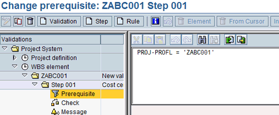 The prerequisite in this example is only expense projects, so you input PROJ-PROFL = 'ZABC001’ (the name of my expense project profile) in the area in the right side of the screen (Figure 14). This validation triggers only if this prerequisite is met. If the project is created with profiles other than ZABC001, this validation does not trigger. You can either directly write the prerequisite or select the field name from the table using the tables provided in the bottom of the validation screen (Figure 15).