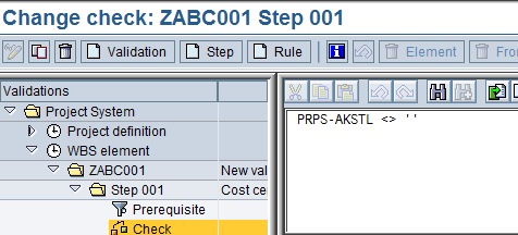 The next step is to create the check. Highlight the Check button that appears below the Prerequisite in the left side and maintain the check that needs to be validated. In my example the check looks for a requesting cost center in the WBS master data provided if the prerequisite of the expense project profile ZABC001 is met. Enter the check as PRPS-AKSTL not equal to blank (Figure 16).