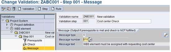 Click the Message button on the right side and enter E in the Message type field. Message type E denotes that the message is an error message and that the system cannot allow the creation of a WBS element without correcting the displayed error. Select the message number that needs to be populated. If the required message is not available in the drop-down list, click the pencil icon and create a new message text with the message number. Click the save icon to save the validation (Figure 18).