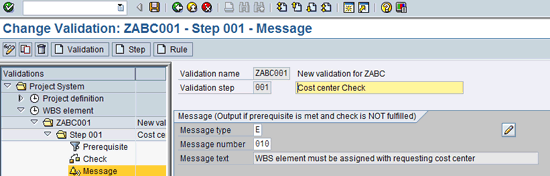 To complete the check, click the message icon. After completing the check, you are ready to create the error message that needs to be populated if your prerequisite is satisfied and the check is not fulfilled. In the next screen highlight the Message button that is under the Check button on the left side. Select the message number that has the appropriate text from the drop-down box. If you create the WBS with an expense project profile without the requesting the cost center, the following error message populates the Message text field (Figure 17): WBS element must be assigned with requesting cost center.