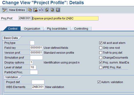 Go to the project profile ZABC001 and enter the validation name as ZABC001 under the Control tab in the Validation section. Select the Autom. validation indicator to ensure that all expense projects are subject to validation defined in ZABC001 and that the system does not allow creating expense WBS without requesting a cost center in the master data.