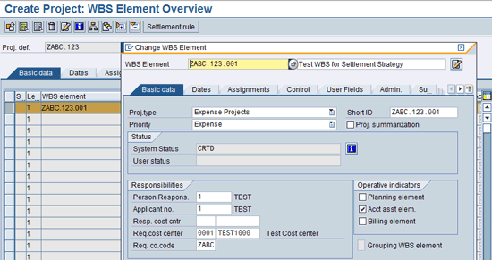 I create two projects: ZABC.123 with WBS ZABC.123.001 and ZABC.456 with WBS ZABC.456.001 with expense project profiles ZABC001. Both WBS elements are assigned with requesting cost center TEST1000 in the WBS master data.