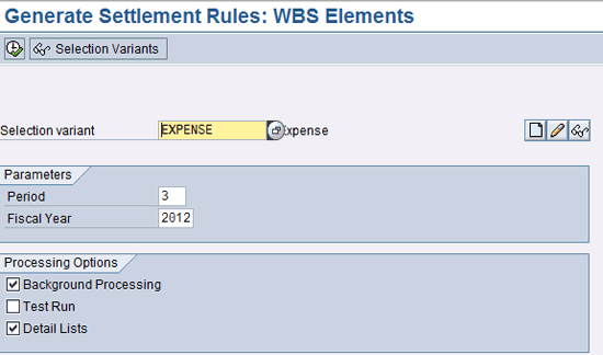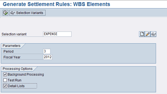 Now go to CJB1 for generation of settlement rules for multiple WBS (Figure 23). In the initial screen enter the Selection variant, Period, and Fiscal Year. Select the Background Processing and Detail Lists indicators in the Processing Options section. Click the create icon (the one to the left of the pencil icon) to create the selection variant.