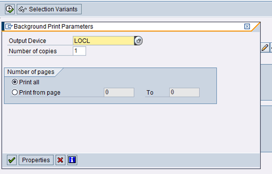 After you click the Confirm button, a new pop-up box appears for print parameters (Figure 32). Enter the name of the output device and click the green check mark icon at the bottom of the screen to schedule the job. The job is automatically released.