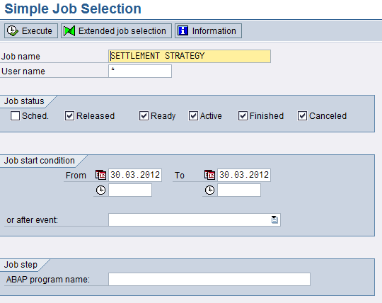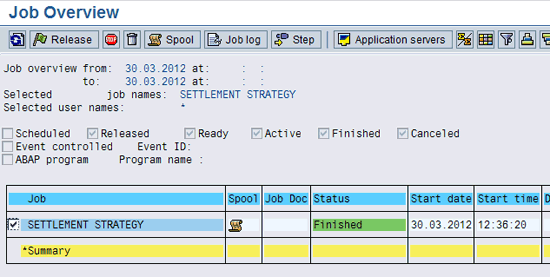 Now use transaction code SM37 and retrieve the job as shown in Figure 33. Enter the job name (e.g., SETTLEMENT STRATEGY) and populate the From and To date fields. Click the Execute button.
