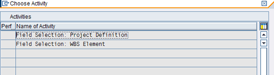 To access field selection for WBS elements use transaction code OPUJ or follow IMG menu path Project System > Structures > Operative Structures > Work Breakdown Structure (WBS) > User Interface Settings. To make the requesting cost center mandatory in WBS element master data, click the execute icon beside Define Field Selection for Work Breakdown Structures. In the Choose Activity pop-up screen (Figure 5), double-click Field selection: WBS Element.