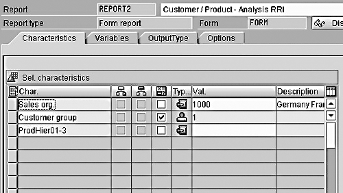 The trick behind using the report/ report interface is to break this CO-PA report into two separate smaller reports, each with fewer characteristics, and calling the second report from the first one. In the given example, you will have one report (REPORT1) with only customer group as the characteristic. The second report (REPORT2) will have the same two characteristics as that of the original report — i.e., customer group and product group (Figure 1). REPORT2, however, will always be executed for one specific value of customer group. In REPORT2, customer group has a local variable, which is passed from REPORT1. All other report parameters are kept the same; both reports are based on the same form and maintain the same structure, including form layout, general data selection criteria, and so on. Linking REPORT2 to REPORT1 (menu path Extras>Report Assignment) creates a report/ report interface between them.