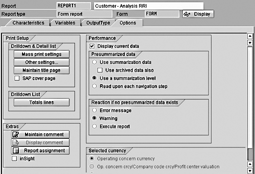 When REPORT2 is called, it is executed for one customer group, so it has a variable for Customer group. To assign REPORT2 as a report/report interface, change to REPORT1 and click on the Options tab. In the Extras box on the left (Figure 2), click on the Report assignment option and then on Insert Row, Report REPORT2. Finally, confirm and save your settings.
