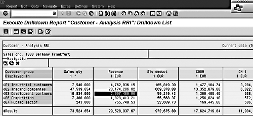 Step 5. Keep your cursor on any customer group row and click on this icon. R/3 will call up REPORT2 automatically and display the corresponding drill-down characteristics for the selected characteristic value from the sender report. Because of this seamless interface between two reports, business users don’t find any difference from an "unsplit" report.