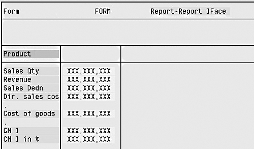 I’ll begin with an example of a typical CO-PA report, Customers Gross Margin Analysis. Let’s say that this report (REPORT) has two drill-down characteristics: customer group and product group. The corresponding report form (FORM) has revenue, costs, and margin as columns. This form has appropriate general data selection criteria of period/year, record type, and company code. Assume that your company has 50 distinct customer groups and 1,000 product groups for the given selection criteria.