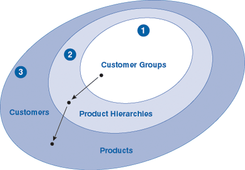 In Figure 10, oval 3 represents all the possible drill-down characteristics for the given CO-PA report. Ovals 2 and 1 represent fewer numbers of characteristics (aggregated characteristics at a higher level). In this example, you should drill-down from customer groups to product hierarchies and to products or customers.