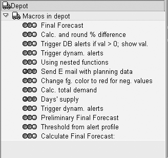 Tip! The rule with the Depot is to store all macros that you are not currently editing in it, even if the macro has been activated. This has significant performance advantages, enabling you to complete editing and testing macros quicker than if you stored them all in the deployment area.