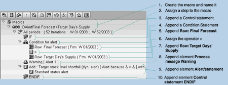 Different types of alerts — dynamic, statistical, or database — are activated and controlled through macros. In addition, macros are used in arithmetical, mathematical, and statistical calculations to refine and complete the forecast with greater confidence in its accuracy.