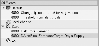 Default event macros are executed when the planner opens the forecast and specifies a selection ID. Then, when the plan is regenerated or saved, it causes the macro to be automatically executed. For example, Figure 3 shows two macros assigned to a default event. One macro changes cell values to red if the values in the row Preliminary Forecast are less than zero. A second macro, Threshold from alert profile, uses an advanced macro function Alert_profile_threshold to warn (via a cell color change) if the value in a cell in the row Consensus Forecast exceeds values specified in the alert profile.