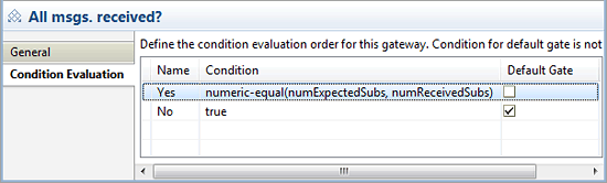 After either filling the company part or adding the subsidiary to the result message, you reach the All msgs. received? gateway. It verifies whether all messages have been received in the meantime. This is obviously the case if the number of expected subsidiary messages (represented by the numExpectedSubs data object) is equal to the number of received subsidiary messages (represented by the numReceivedSubs data object). Hence, the expression for the Yes gate looks like the one shown in Figure 13.
