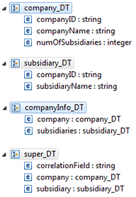 Instead of working with orders and order items, the scenario works with a company and its subsidiaries. At the top of Figure 2 you can identify the company’s header information contained in the company_DT structure. It consists of the company’s unique identifier (companyID), the company’s name (companyName), and the number of its subsidiaries (numOfSubsidiaries). Beneath the header segment in Figure 2 you can find the segment for each subsidiary (subsidiary_DT). It is linked to the header segment via the unique identifier (companyID) and also contains a field that holds the subsidiary’s name (subsidiaryName). These are the basic segments. In the third place you can find the structure that the receiving system expects (companyInfo_DT): one data structure comprising both the header segment and all the subsidiary segments that belong to the company. There must be as many subsidiary segments as indicated by the numOfSubsidiaries field of the header segment. However, note that the cardinality of the subsidiaries field in the companyInfo_DT structure in Figure 2 is zero to unbounded.