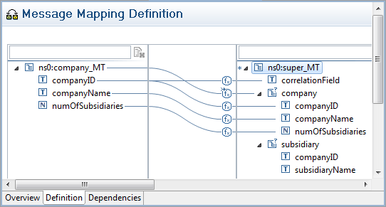 Depending on the result of the evaluation at the Is Company Set? gateway, the process continues with either the Set Company Msg or the Append Subsidiary Msg mapping step. First, look at the Set Company Msg step. The associated mapping is depicted in Figure 11.