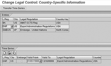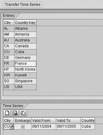 Countries on an embargo list are maintained via the Country Information option in the Embargo tab. This option is used for both export and import controls and processes. Figure 2 shows a typical embargo entry. Note that all countries exported to and imported from are listed under the Entries tab. Countries under embargo are checked off in the Time Series section.