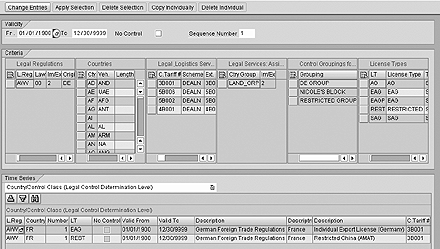 Figure 4 shows an example of a set of license type determination rules and offers a view of legal regulations for a departure country, destination country, ECCN, country group, ECCN grouping, and license type. The license type determination table is built via the Determination Strategy for License Type tab in the GTS Compliance Management: Legal Control – Export screen in Figure 1 and based on the license determination procedure. License type determination tables are built using values from the Valid From, Valid To, and Number fields in the Time Series tab in Figure 4. These values are combined via icons in the tab such as change entries, apply selection, etc., with selection criteria maintained in the Legal Regulation fields in the Criteria tab like destination country and ECCN.