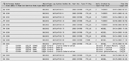 The blocked document report is one of the most often used reports and is run by the export group to review all the blocked export transactions. Documents can be blocked for embargo, SPL screening, missing classification, missing license determination, and missing license. A document is revalidated against the current export data/status using the Legal Control – New Check option in the blocked report. The option allows you to directly access the Legal Control: Change Control Data screen in Figure 6.