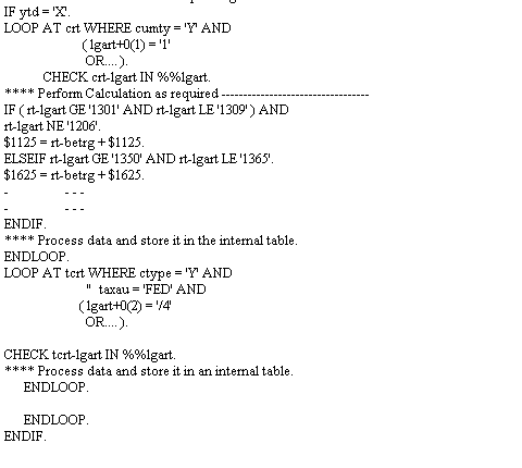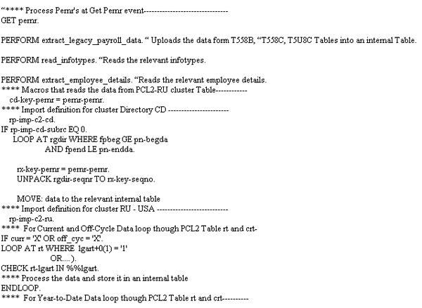 After the data is loaded successfully into the payroll cluster for all the employees, you can use the custom payroll comparison report to read data from the T* tables and payroll clusters (sample code is provided in Figures 12 and 13). You can use this logic as a starting point to build your own payroll comparison report.