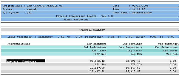 - Running a comparison program report to compare variations in earnings, deductions, and taxes between the SAP payroll run and the legacy payroll run