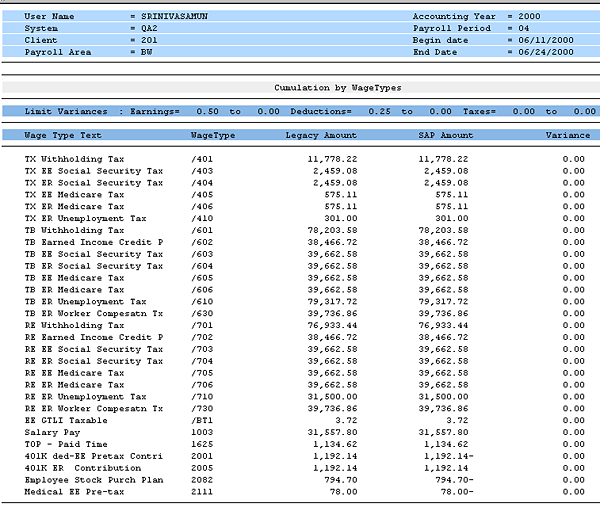 The summary by each employee report displays a summarized report as shown in Figure 16. Earning wage types, deduction wage types, and tax wage types are cumulated and displayed for SAP payroll data, legacy payroll data, and their variances.