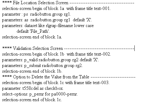 Selection screen options for loading data based on the personnel number and with the option to delete