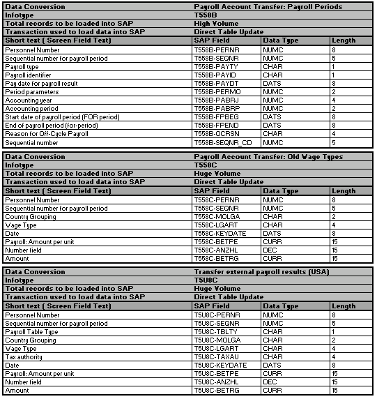 - Extracting, transforming, and loading period data from the legacy system into SAP payroll tables (T* tables). This data is used by a comparison program.