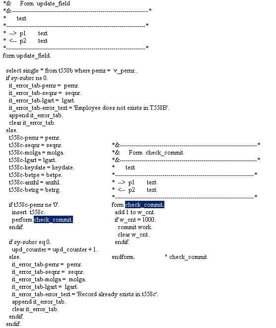 Figures 19 and 20 contain some of the tables used in all country versions for payroll. Check the routine check (check_commit.) in Figure 20. This simple performance improvement code snippet reduced load time by almost 85 percent; you can use the same logic for other tables.
