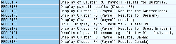 After a successful payroll run, verify the data for an employee by using the standard SAP system report H99_DISPLAY_PAYRESULT for all countries or one of the payroll reports listed in Figure 5 to display country-specific payroll results. To display US payroll results for a given personnel number you can use program RPCLSTRU (use program RPCLSTRX to list international payroll results).