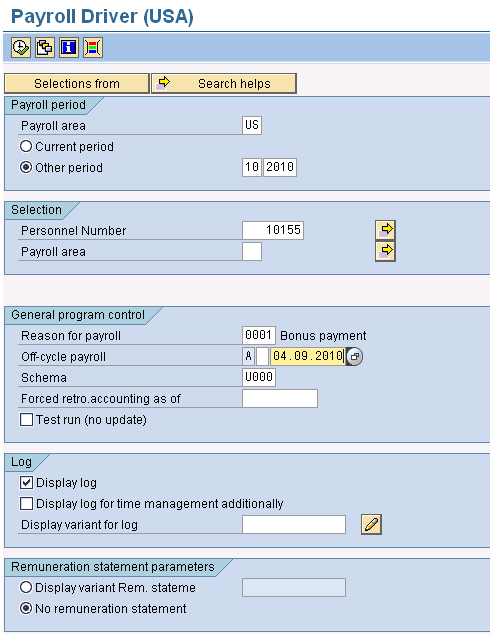 - Run the US payroll driver using US payroll schema ULK9 (or ZLK9)