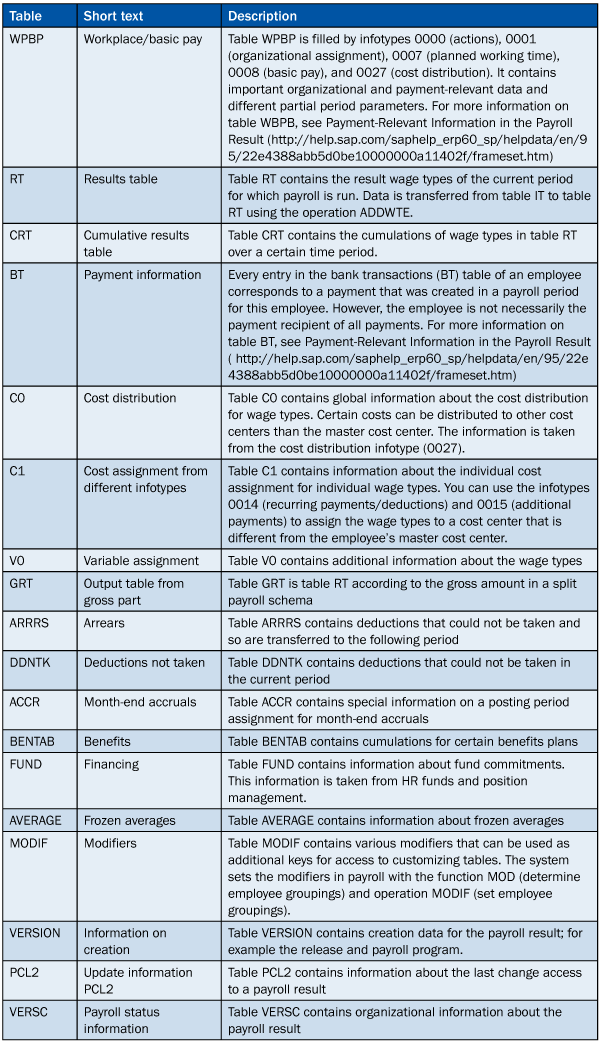 This data is transferred from various infotypes and tables into the payroll cluster RU tables WPBP, RT, CRT, BT, and other internal tables (Table 1).