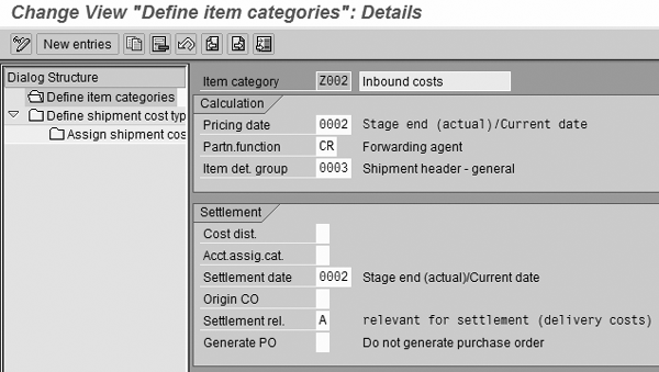Next, define the item category that controls how the system settles inbound freight costs. Use the same
