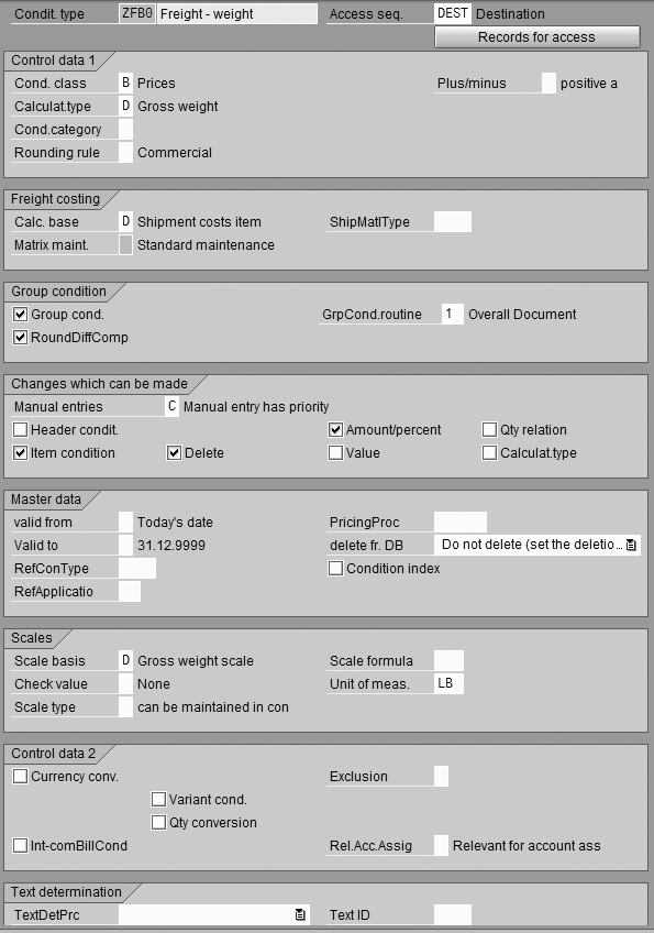 types in the system. I created a condition type for the basic calculation of freight based on the weight of the shipment.