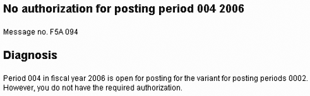In my example, when users without authorization group 0001 in their profiles attempt to post to previous period 4, they receive the error message shown in Figure 2. These users are blocked from posting to the previous period.