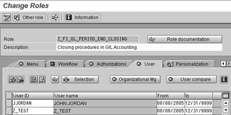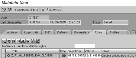 Step 3. Access the user's master record. Go to transaction SU01 to display the user master record for the user you wish to assign to authorization group 0001. Click on the edit icon, and then click on the Roles tab to display the screen shown in Figure 5.