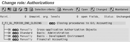 Step 4. Edit the user's authorizations. A list of roles assigned to the user appears. Double-click on the role chosen in step 2, in this example Z_FI_GL_PERIOD_END_CLOSING. Click on the edit icon in the resulting Display Roles screen, then click on the Authorizations tab. Next, click on the change authorization data icon at the bottom of the screen to display the Change role: Authorizations screen shown in Figure 6. This is a hierarchical display of authorization objects.