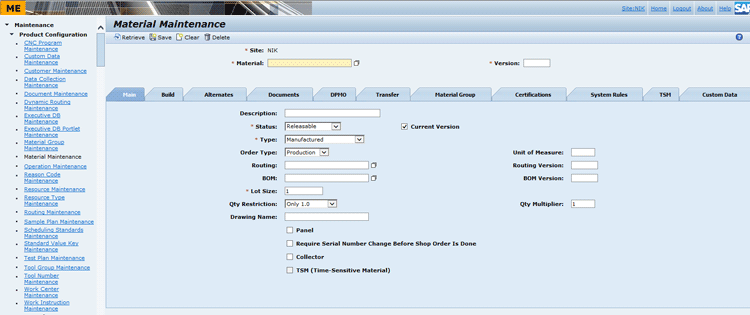 First, create two materials — PARENT and PART1. PART is a sub-material that can be assembled to a parent material, just as tires, handles, and seats are child materials to a frame of a bike (parent). Click the Material Maintenance link in the left frame (menu) and the associated screen opens in the right frame as shown in Figure 7.