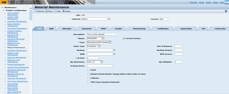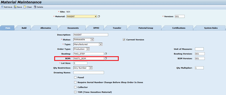 Figure 1You can now create the parent material through Material Maintenance activity. Click the Material Maintenance link. In the screen on the right enter PARENT in the Material field, 001 in the Version field, TWO_STEP in the Routing field, and PART1_BOM in the BOM field. Click the Save button to save the PARENT material details to the database as shown in Figure 14.