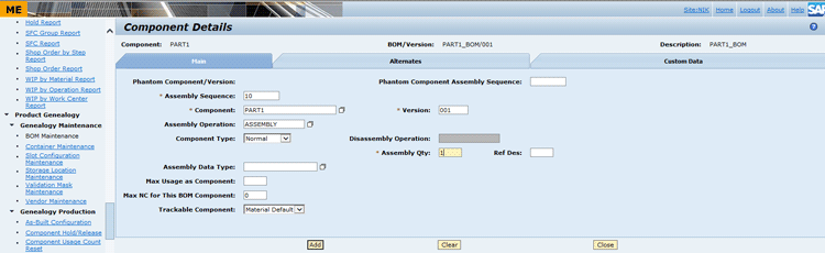 In Figure 20, NIK334 is the SFC number for component SFC. It is created directly in the ME system and is not related to the functionality of the custom scripts I show. Basic functional ME knowledge is sufficient for it. After entering details, click the Add button at the end of the screen. The system checks that in BOM it was mentioned that only one component SFC quantity is required. Because you entered that, it closes the Assemble screen automatically and displays the following message at the top of screen: All components assembled at this operation.