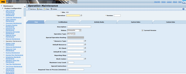 Before creating the parent material, you need to create routing for it. To create the routing, click the Operation Maintenance link in the menu in the left frame. This action opens the associated screen as shown in Figure 11.